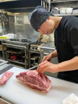 提供するのは、厳選した国産牛や4~5等級の上質な和牛など。肉は塊で仕入れ、丁寧に手切りしています。サシと赤身のバランスが良く、うま味とコクをしっかりと感じられる肉質が特長。中でもおすすめは、さっぱりとした口当たりながら深い味わいを楽しめる「咲咲亭カルビ」です。味の決め手となるのが、店内で製造する自家製タレ。味噌と醤油をベースに約8種類の調味料を独自にブレンドし、1週間熟成させて深みを引き出します。化学調味料を使用しない無添加も継承。隠し味に青きな粉を使い、甘みには三温糖を使うなど、天然素材へのこだわりが光ります。さらに、ほぼすべての肉に細かな切り込みを入れて繊維を断ち、歯切れの良さとタレのなじみを高めることで、肉とタレが一体となった味わいを実現しています。